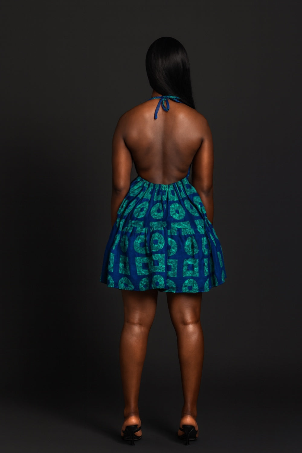 Turn heads in this effortlessly chic backless mini dress, crafted from vibrant blue and teal African-inspired print. The dress features a gathered waistline that flatters your silhouette and a flowy A-line skirt for a playful yet elegant look. Perfect for warm days or evening outings, its halter neckline and open-back design add the right touch of allure and sophistication